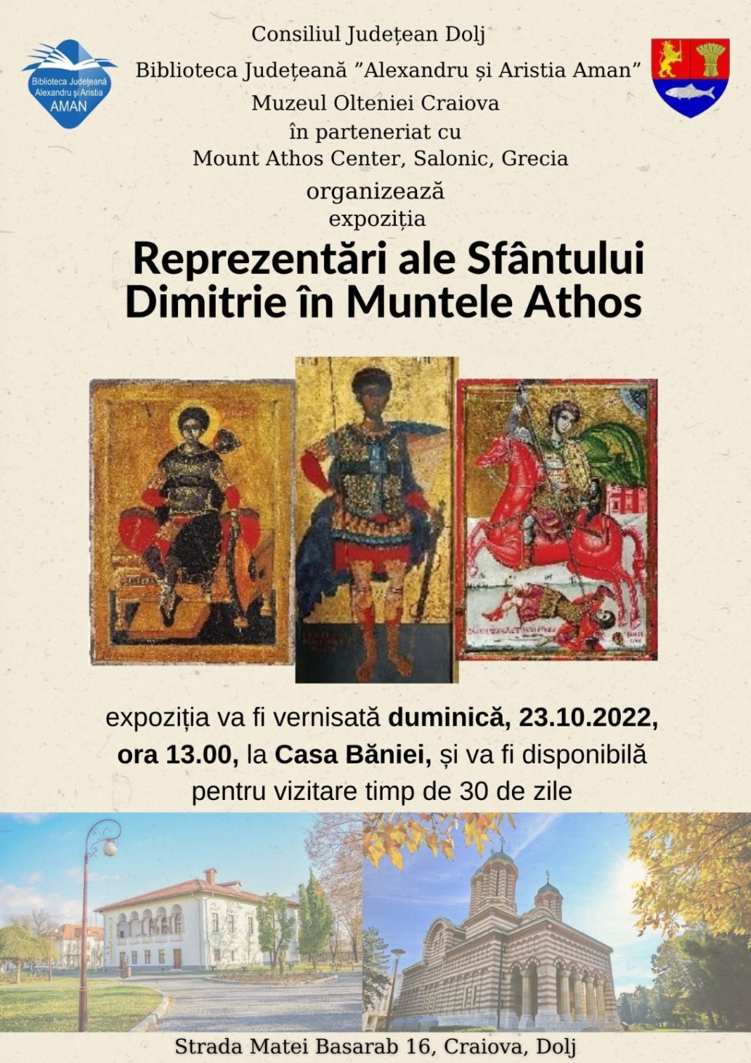 Biblioteca Județeană „Alexandru și Aristia Aman”, în parteneriat cu Muzeul Olteniei Craiova și „Mount Athos Center”, Salonic, Grecia, organizează duminică, 23 octombrie 2022, ora 13.00, la Casa Băniei, vernisajul expoziției „Reprezentări ale Sfântului Dimitrie în Muntele Athos”.