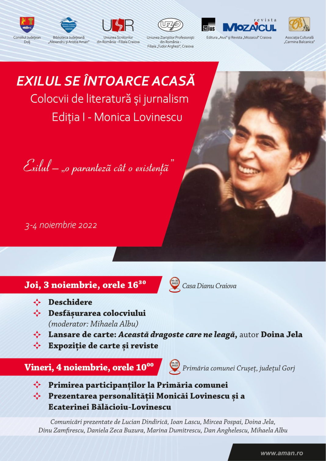 Biblioteca Județeană „Alexandru și Aristia Aman”, alături de Uniunea Scriitorilor din România (Filiala Craiova), Uniunea Ziariștilor Profesioniști din România (Filiala „Tudor Arghezi”, Craiova), Asociația Culturală „Carmina Balcanica”, Editura „Aius” și revista „Mozaicul”, organizează în perioada 3 – 4 noiembrie 2022 evenimentul cultural intitulat „Exilul se întoarce acasă. Colocvii de literatură și jurnalism. Ediția I – Monica Lovinescu”.