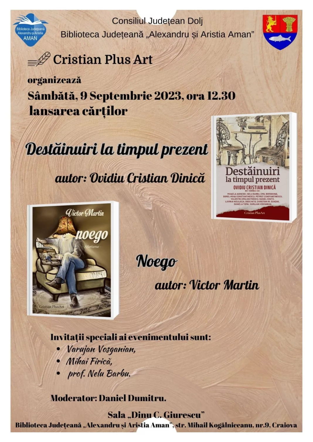 Biblioteca Aman va lansa, sâmbătă, volumele „Destăinuiri la timpul prezent”, de Ovidiu Cristian Dinică, și „Noego – aforisme ”, de Victor Martin.