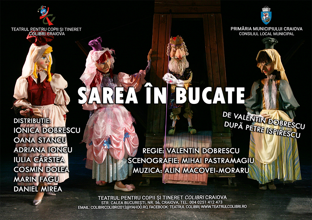Mâine, la ora 18.00, se va juca spectacolul „Sarea în bucate“ adaptare după Petre Ispirescu, scenariul şi regia Valentin Dobrescu. Spectacolul pune în lumină valori ca sinceritatea, modestia, toleranța și frumusețea omului care și le asumă.