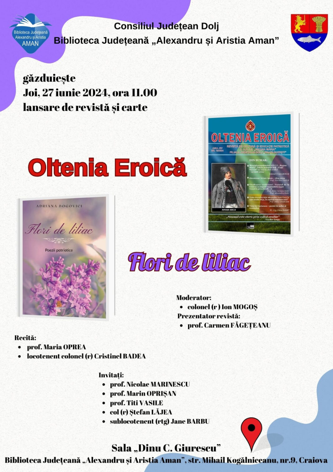 Biblioteca Județeană „Alexandru și Aristia Aman” organizează joi, în parteneriat cu Asociația Națională Cultul Eroilor „Regina Maria”, Filiala Județului Dolj „Frații Buzești”, lansarea numărului 19/2024 al revistei „Oltenia Eroică”, precum și lansarea volumului „Flori de liliac”, autor Adriana Bozovici.