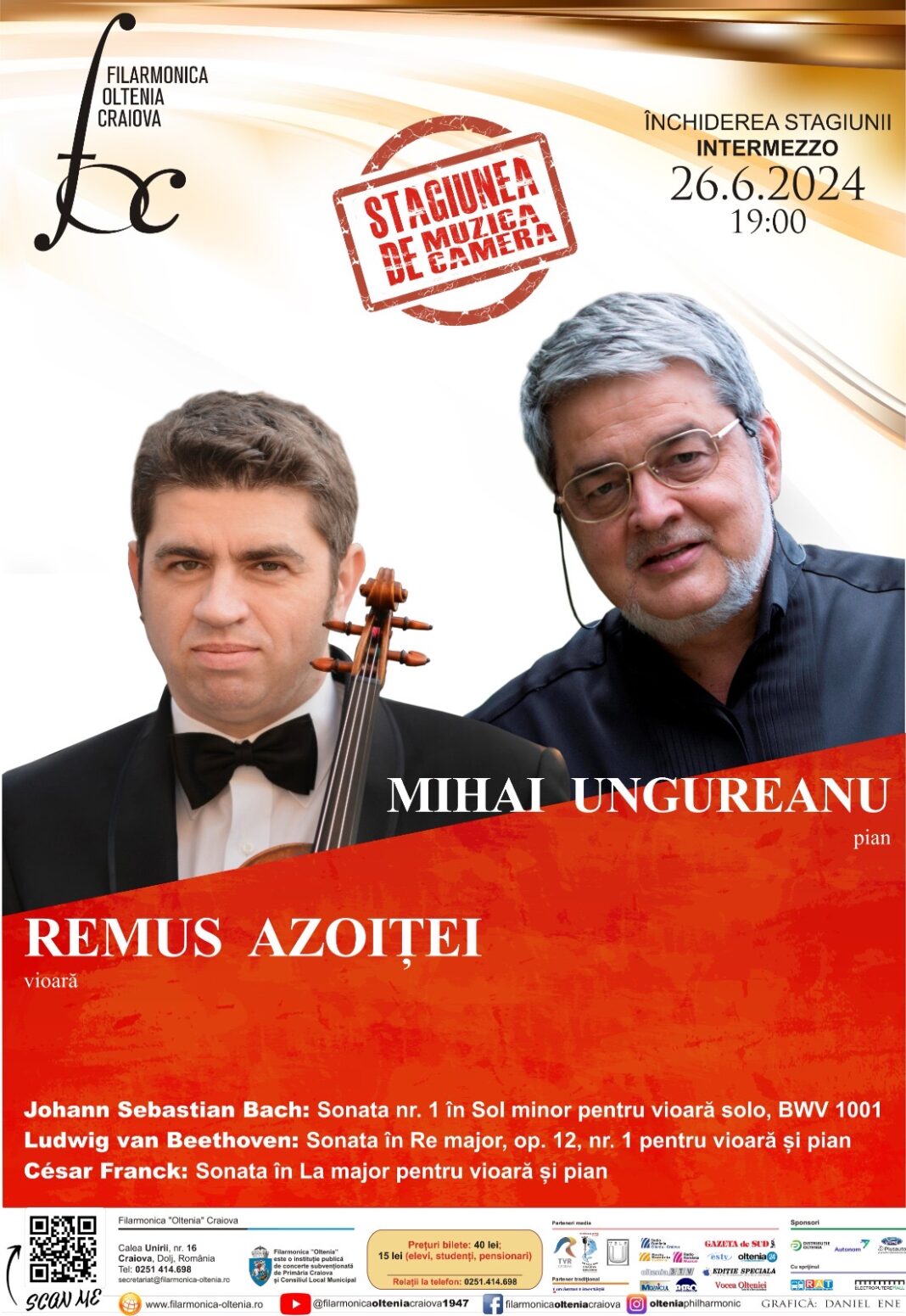 La Filarmonica Oltenia Craiova se va încheia, miercuri, stagiunea de muzică de cameră cu un recital de excepție. Începând cu ora 19.00, pe scena filarmonicii vor evolua doi muzicieni de renume internațional: violonistul Remus Azoiței și pianistul Mihai Ungureanu.