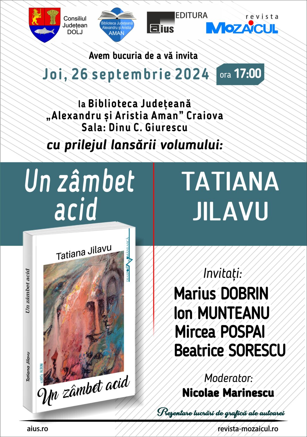 Biblioteca Județeană „Alexandru și Aristia Aman” găzduiește joi, 26 septembrie 2024, lansarea volumului „Un zâmbet acid”, autor Tatiana Jilavu.