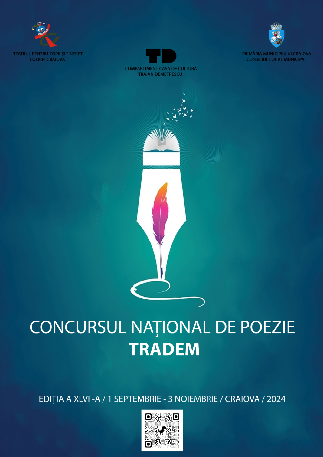Concursul Național de Poezie TRADEM 2024, organizat de Teatrul Craiova – Compartimentul Casa de Cultură „Traian Demetrescu“, se va încheia pe 3 noiembrie. Este unul dintre cele mai longevive concursuri de poezie din România, ai cărui laureați de-a lungul timpului au devenit autori apreciați din literatura contemporană.