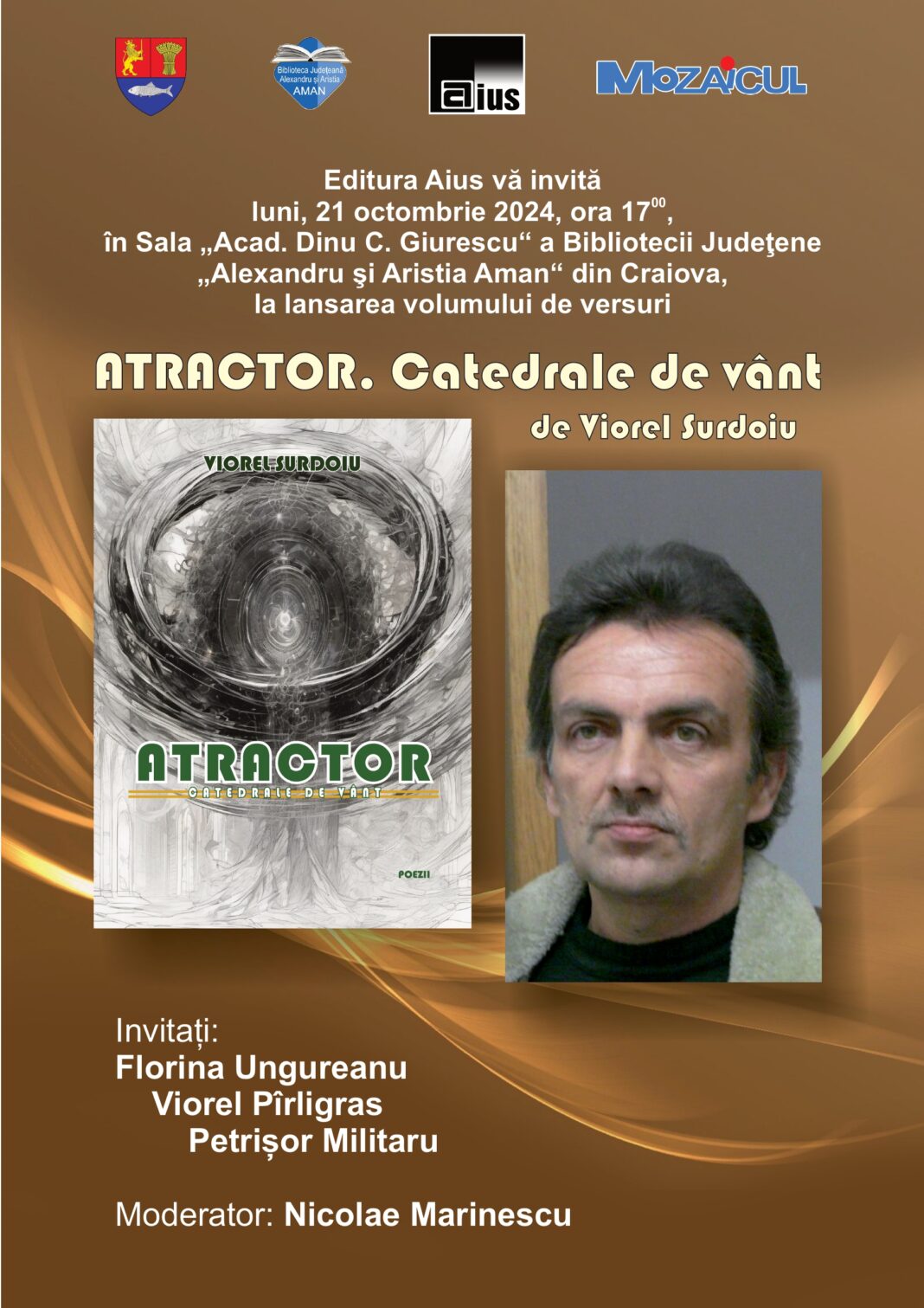 Biblioteca Aman găzduiește luni, 21 octombrie, lansarea volumului „Atractor. Catedrale de vânt”, autor Viorel Surdoiu.