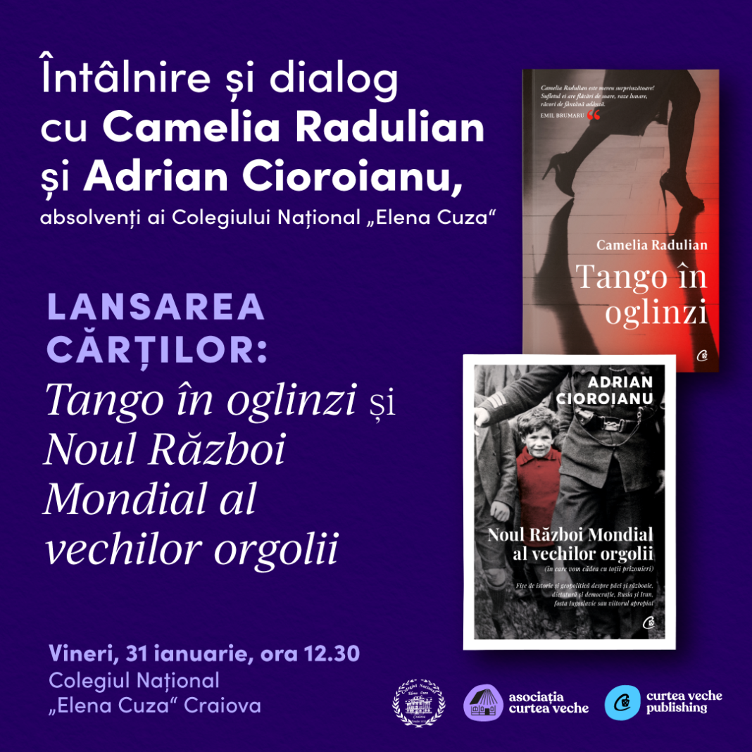 Cititorii din Craiova vor avea prilejul să participe la lansarea cărților „Tango în oglinzi” de Camelia Radulian și „Noul Război Mondial al vechilor orgolii” de Adrian Cioroianu. Fiecare moment editorial de la Craiova va fi urmat de o sesiune de autografe.