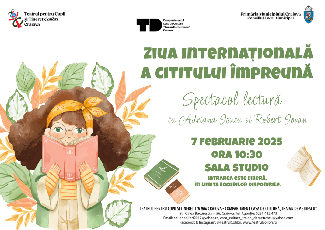Teatrul Colibri Craiova face spectacol lectură din bucuria de a citi, vineri, 7 februarie, începând cu ora 10.30. Cei ce iubesc să se aventureze în paginile cărților sunt așteptați la teatru să celebreze Ziua Internațională a Cititului Împreună.