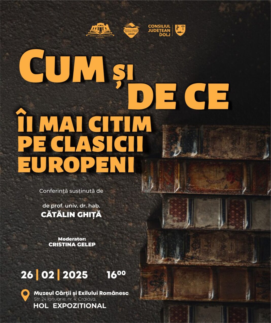 Muzeul Cărții și Exilului Românesc găzduiește miercuri, 26 februarie, începând cu ora 16.00, conferința susținută de prof. univ. dr. hab. Cătălin Ghiță, intitulată „Cum și de ce îi mai citim pe clasicii europeni”.