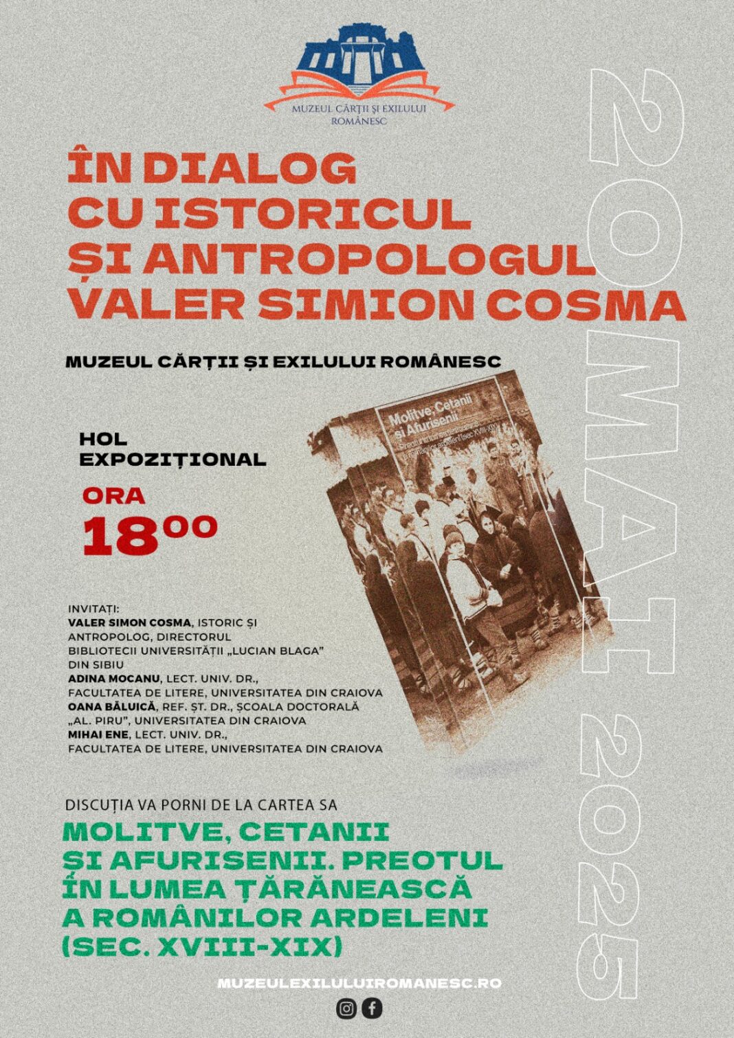 Muzeul Cărții și Exilului Românesc găzduiește marți, 20 mai, la ora 18.00, în holul expozițional, evenimentul cultural intitulat „În dialog cu istoricul și antropologul Valer Simion Cosma”.