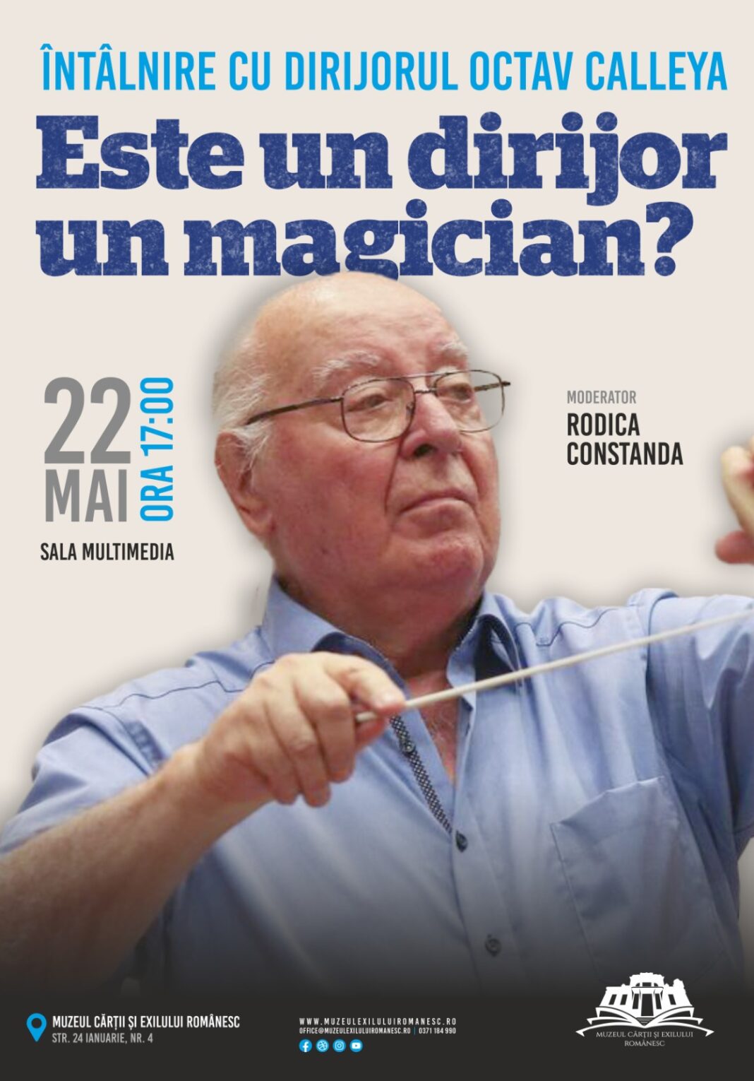 Muzeul Cărții și Exilului Românesc organizează joi, ora 17.00, în sala Multimedia, conferința „Întâlnire cu dirijorul Octav Calleya. Este un dirijor un magician?”, susținută de celebrul dirijor Octav Calleya.