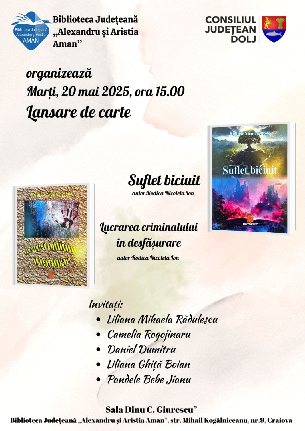 Biblioteca „Aman” găzduiește mâine, lansarea volumelor „Lucrarea criminalului în desfășurare” și „Suflet biciuit”, autor Rodica Nicoleta Ion.