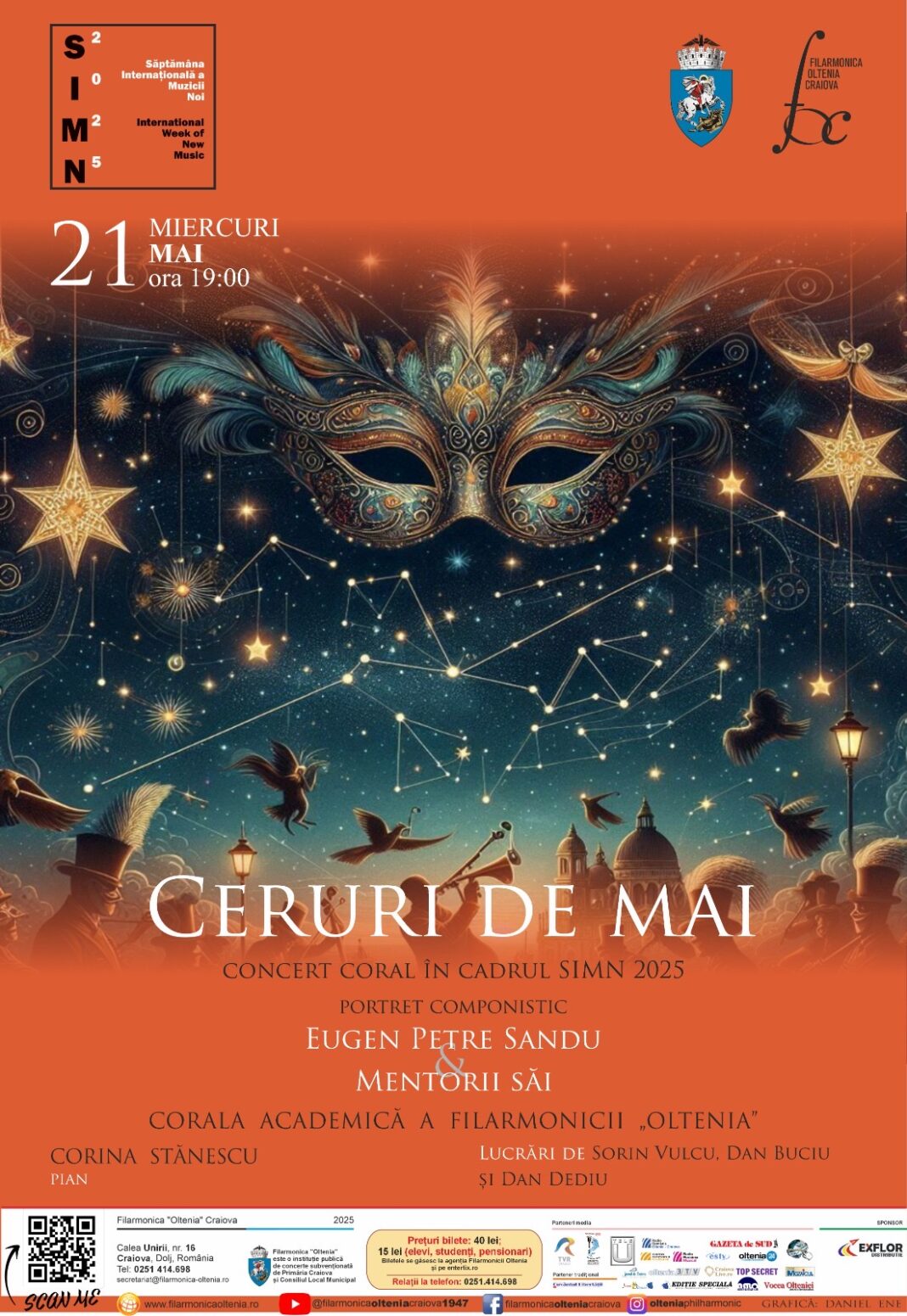 Mâine, în cadrul Săptămânii Internaționale a Muzicii Noi, Filarmonica Oltenia găzduiește un eveniment dedicat compozitorului Eugen Petre Sandu, sub titlul „Ceruri de Mai – Eugen Petre Sandu și mentorii săi”. Concertul aduce în prim-plan creația corală românească contemporană, într-o perspectivă personală și confesivă, ce reflectă continuitatea școlii componistice românești.