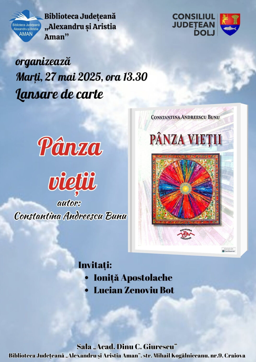 Biblioteca Județeană „Alexandru și Aristia Aman” găzduiește mâine, lansarea volumului „Pânza vieții” autor Constantina Andreescu Bunu. Evenimentul se va desfășura în sala „Acad. Dinu C. Giurescu” începând cu ora 13.30, în prezența invitaților: Ioniță Apostolache și Lucian Zenoviu Bot.