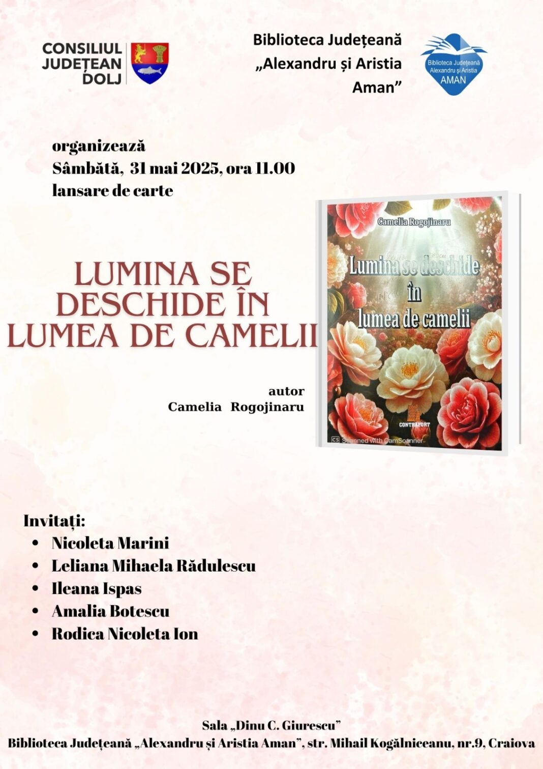 Biblioteca „Aman” găzduiește sâmbătă, 31 mai, lansarea volumului „Lumina se deschide în lumea de camelii” autor Camelia Rgojinaru.