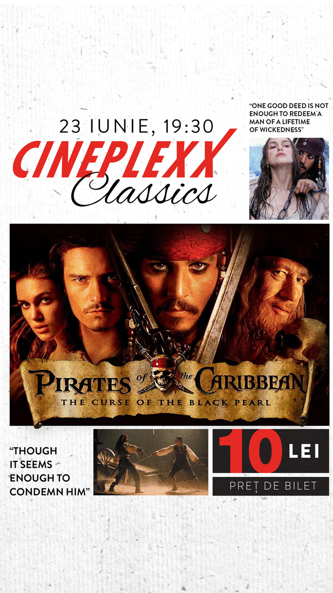 Avându-i în distribuție pe Johnny Depp, Orlando Bloom, Keira Knightley și Geoffrey Rush, filmul este o reușită artistică și comercială ce a fascinat generații întregi. De la bătăliile navale spectaculoase, la dialogurile pline de spirit și intrigile supranaturale, fiecare scenă este o dovadă a măiestriei cinematografice Disney. Aceasta este ocazia perfectă de a experimenta din nou – sau pentru prima dată – farmecul unui film care a scris istorie, cu un preț special de doar 10 LEI biletul, doar la Cineplexx!