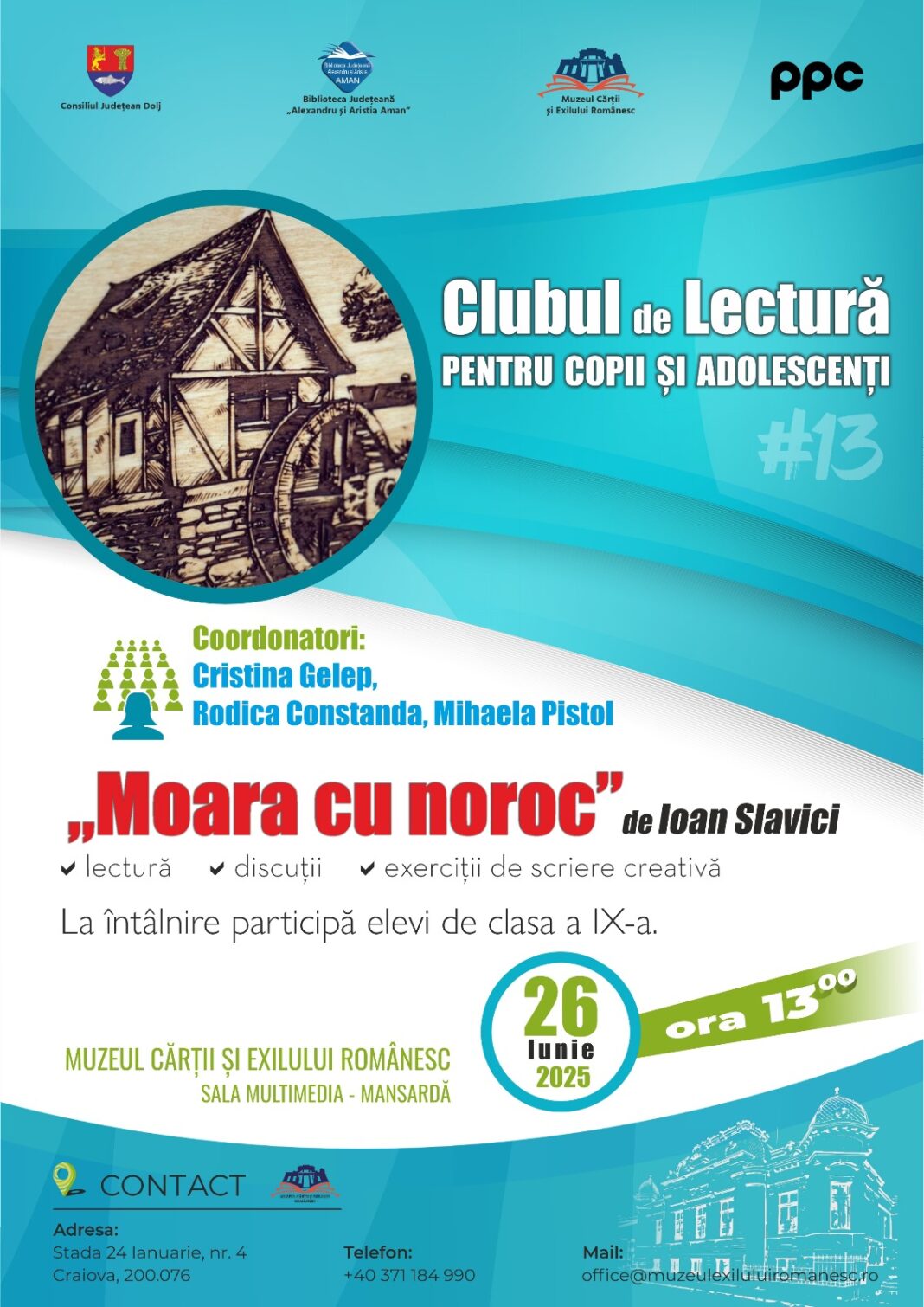 Muzeul Cărții și Exilului Românesc organizează joi, ora 13.00, în sala multimedia, cea de-a treisprezecea întâlnire din cadrul proiectului „Clubul de lectură pentru copii și adolescenți”.