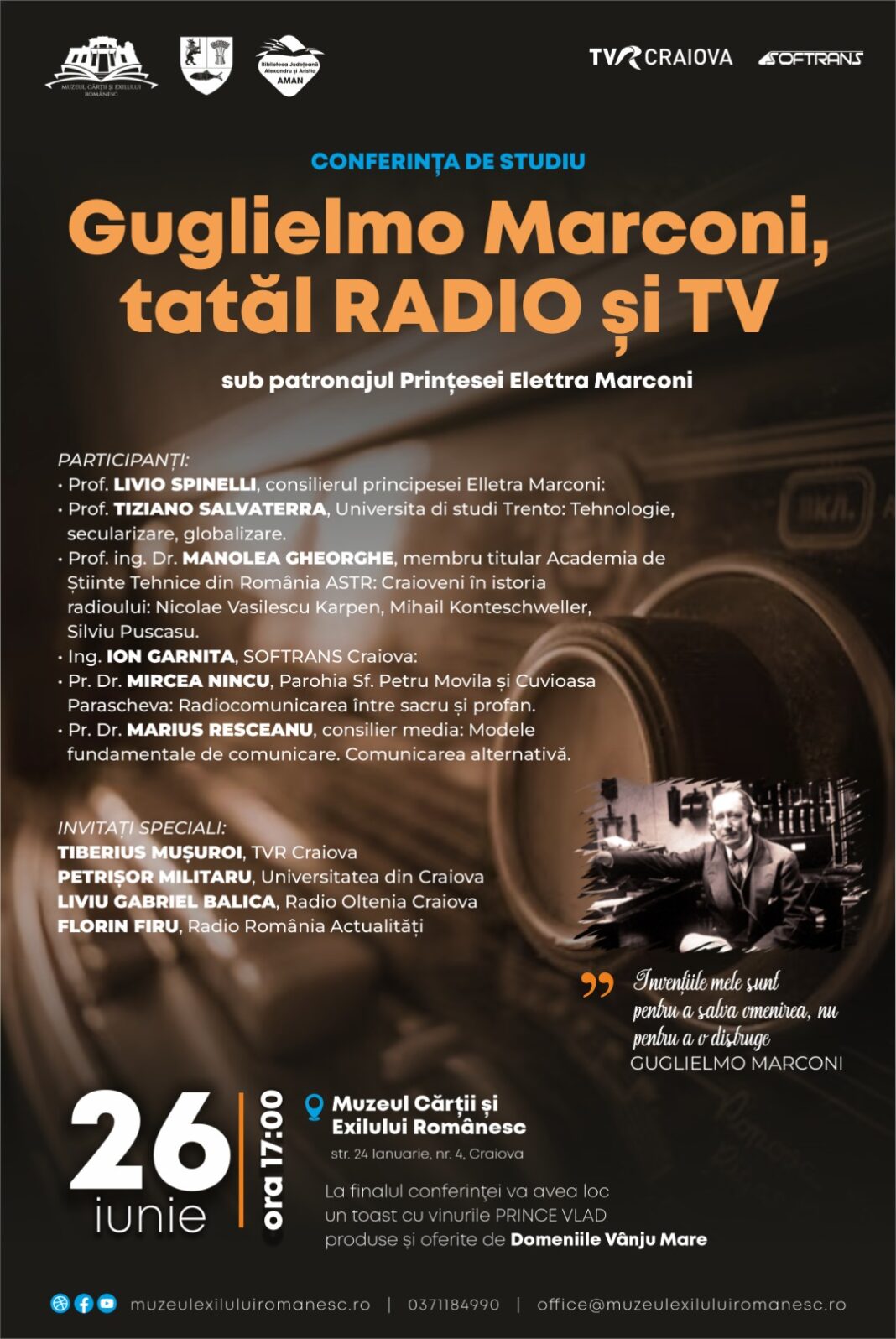 Muzeul Cărții și Exilului Românesc, sub patronajul Prințesei Elettra Marconi, organizează, mâine, ora 17.00, conferința de studiu „Guglielmo Marconi, tatăl RADIO și TV”.