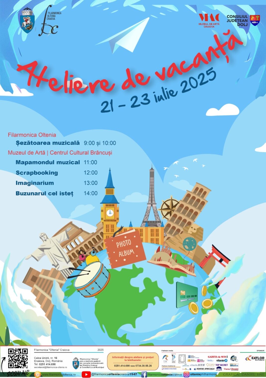 În perioada 21–23 iulie, copiii din Craiova sunt invitați să descopere o vacanță altfel – una în care muzica, jocul și creativitatea devin puncte de plecare pentru descoperire și bucurie. Sub titlul Vacanța la Muzeu, Filarmonica „Oltenia” Craiova și Muzeul de Artă propun o serie de ateliere interactive dedicate copiilor cu vârste între 7 și 14 ani.
