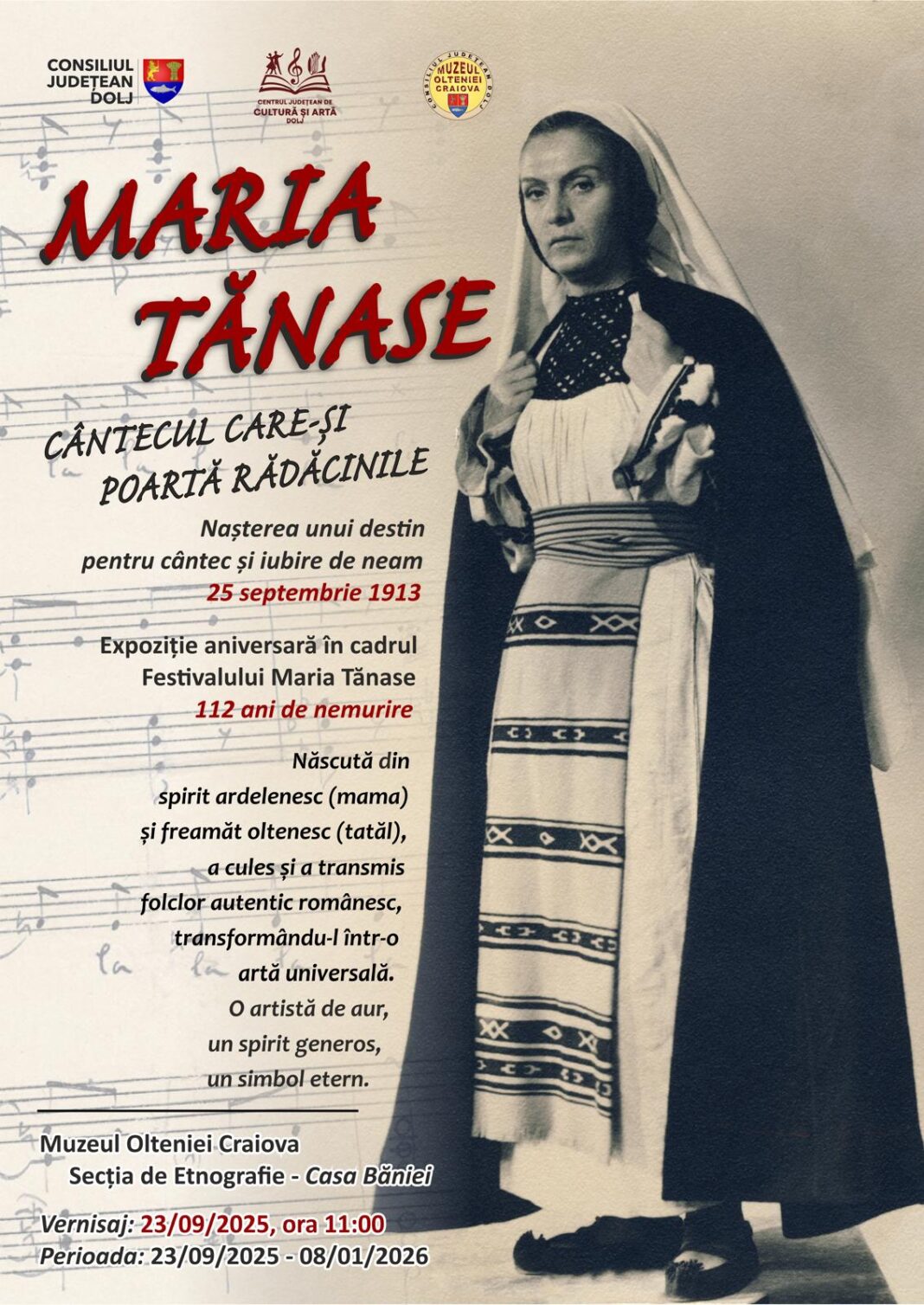 Muzeul Olteniei, Secția de Etnografie, organizează expoziția „Maria Tănase – Cântecul care-și poartă rădăcinile”. Vernisajul va avea loc pe 23 septembrie, ora 11:00, la Casa Băniei, în cadrul celei de-a XXVIII-a ediții a Festivalului-Concurs „Maria Tănase”. Este cel mai longeviv eveniment de muzică populară din România, desfășurat în Craiova încă din 1969.