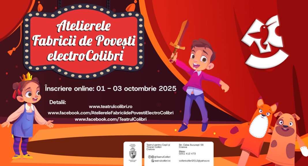 Înscrieri se fac în intervalul 1 – 3 octombrie 2025, doar prin formular on-line, link-urile pentru fiecare atelier în parte fiind disponibile din 1 octombrie, de la ora 09:00, până în data de 3 octombrie – ora 12:00, pe paginile de facebook: AteliereleFabriciidePovestiElectroColibri/ și TeatrulColibri.