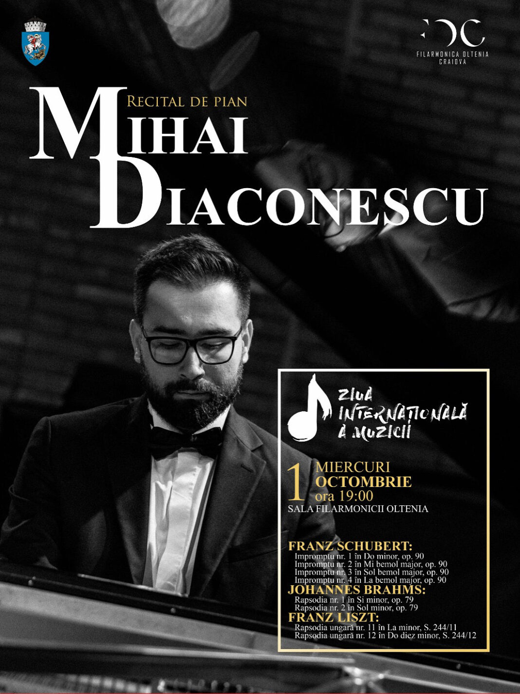 Filarmonica „Oltenia” va marca Ziua Internațională a Muzicii, pe 1 octombrie, printr-un recital de pian susținut de Mihai Diaconescu, muzician originar din Craiova. Evenimentul va avea loc în Sala Filarmonicii și va reuni publicul în jurul unui program alcătuit din lucrări semnate de Franz Schubert, Johannes Brahms și Franz Liszt.