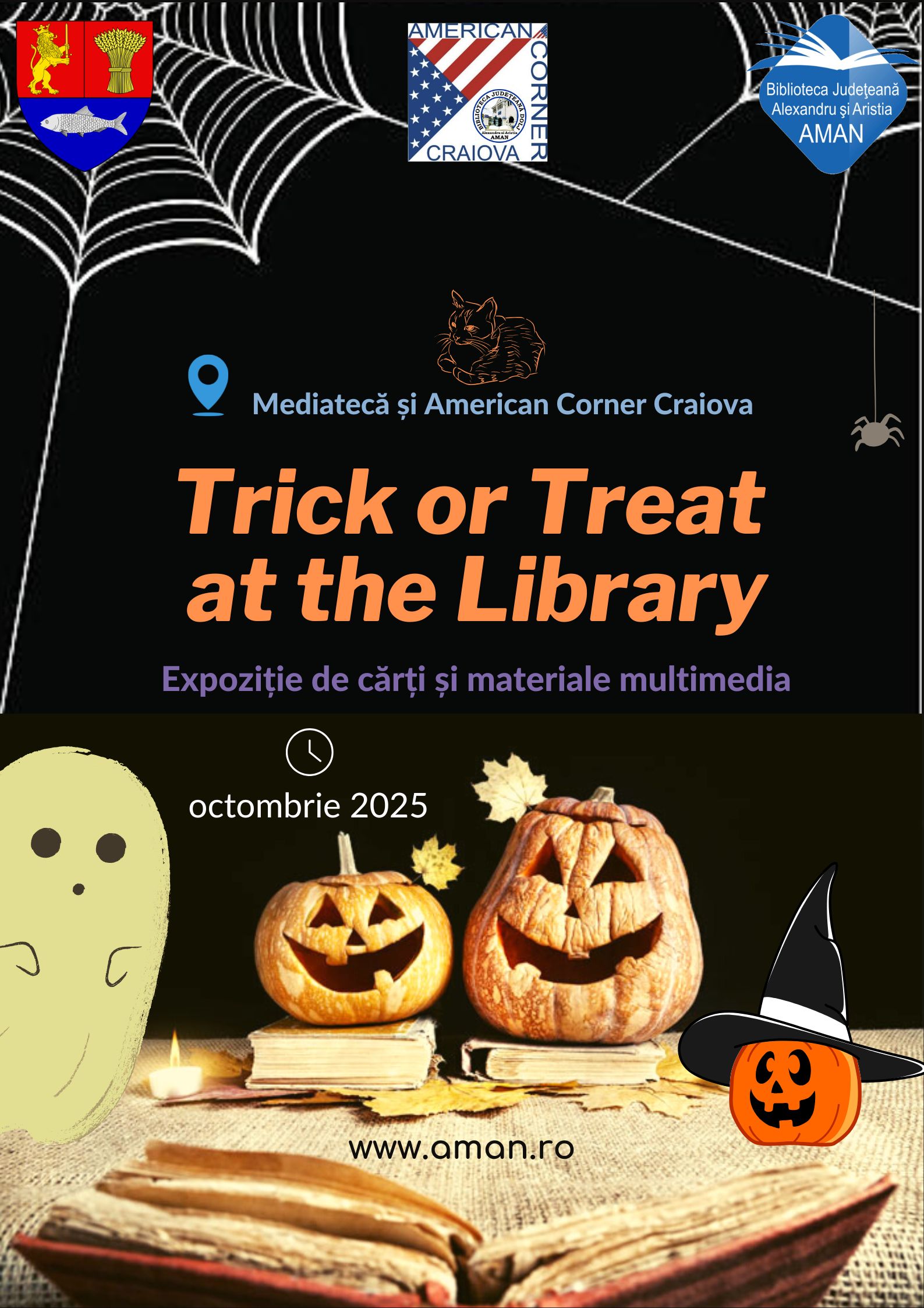 Biblioteca Județeană „Alexandru și Aristia Aman” Craiova organizează expoziția de cărți și materiale multimedia intitulată „Trick or Treat at the Library”. Expoziția marchează sărbătoarea de Halloween și poate fi consultată în perioada 20 octombrie – 7 noiembrie. În cadrul acesteia propunem cărți și filme, atât pentru cei mici cât și pentru cei mari.