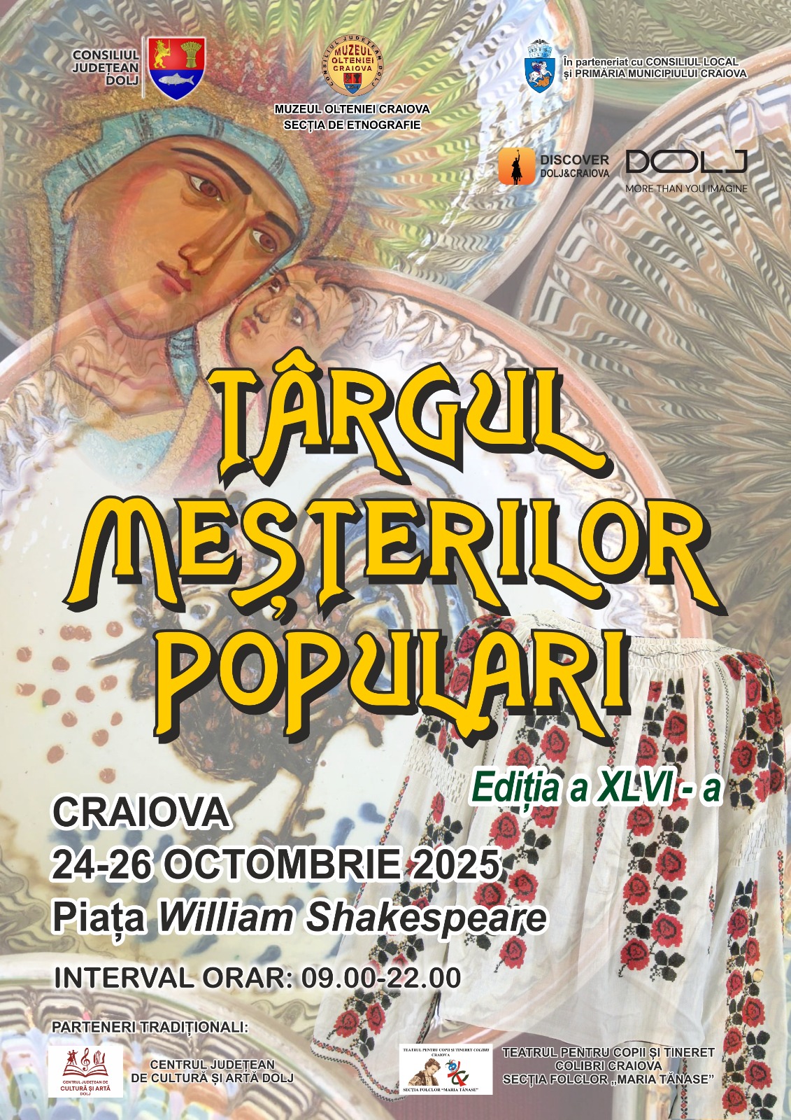 În perioada 24-26 octombrie, în Piața „William Shakespeare” din Craiova, se desfășoară ediția a 46-a a Târgului Meșterilor Populari.
