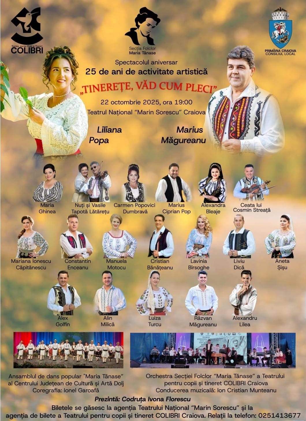 Secția Folclor „Maria Tănase“ a Teatrului Colibri celebrează 25 de ani de activitate artistică printr-un spectacol de excepție cu Liliana Popa și Marius Măgureanu.