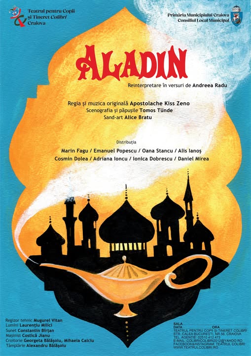 Duminica aduce o nouă aventură: spectacolul „Aladin“, o reinterpretare în versuri semnată de Andreea Radu, cu regia și muzica originală de Apostolache Kiss Zeno.