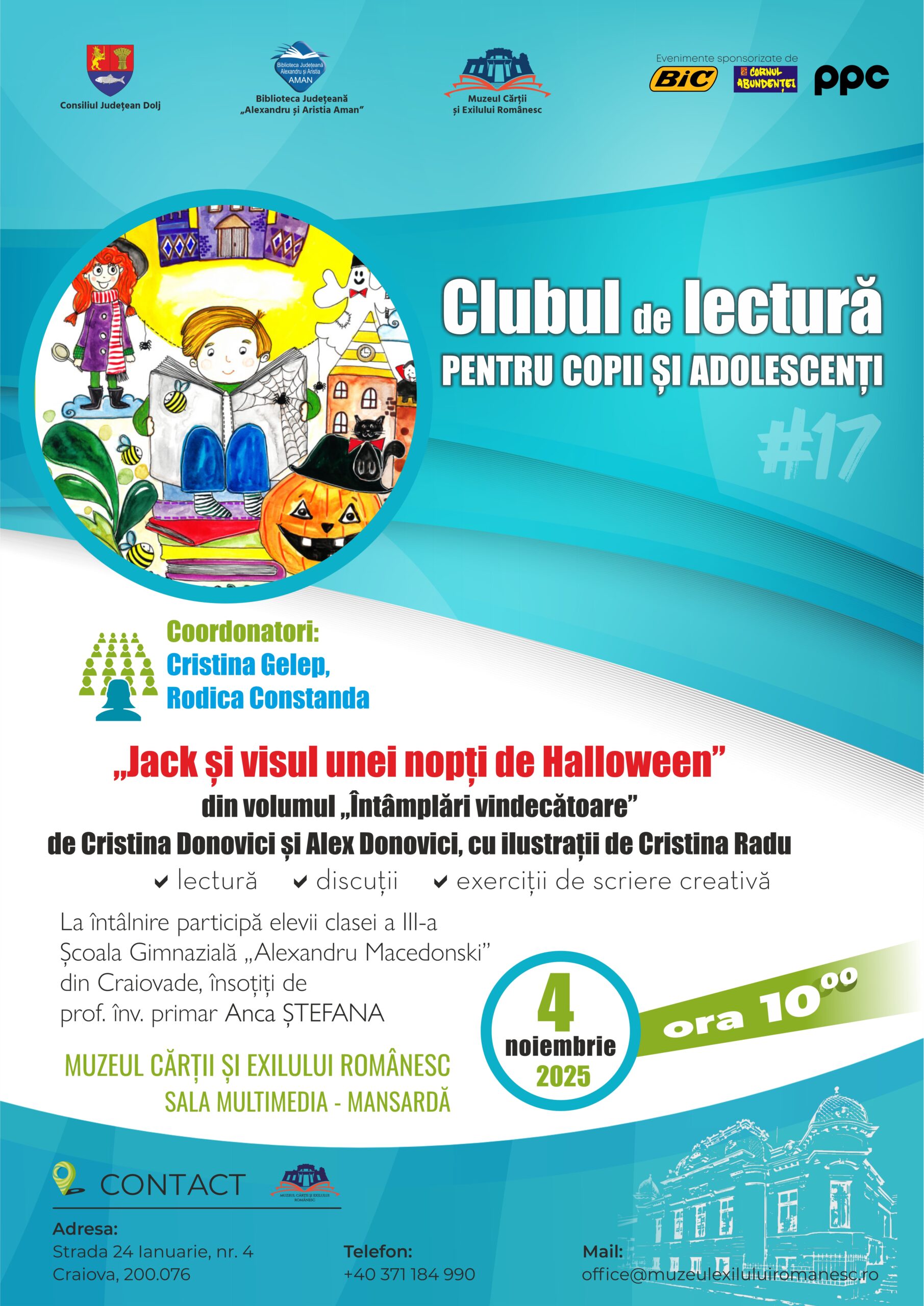 Muzeul Cărții și Exilului Românesc organizează marți, 4 noiembrie, la ora 10, în sala multimedia, cea de-a șaptesprezecea întâlnire din cadrul Clubului de lectură pentru copii și adolescenți.