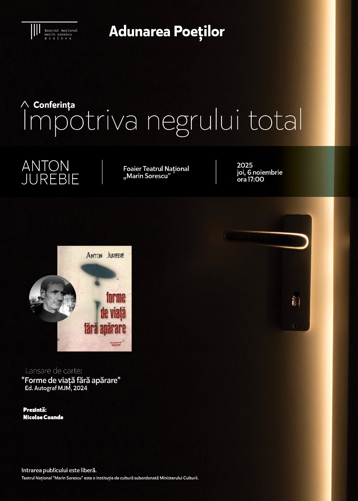 Poetul Anton Jurebie este invitatul lui Nicolae Coande la Teatrul Național „Marin Sorescu”. Anton Jurebie va susține conferința „Împotriva negrului total” și va citi din volumul publicat în 2024, „Forme de viață fără apărare” (Ed. Autograf MJM, Craiova), joi, 6 noiembrie, ora 17.00 – în cadrul evenimentului „Adunarea Poeților” 2025. Evenimentul va avea oc la HUB Shakespeare Craiova (fosta Librărie a Școlii).