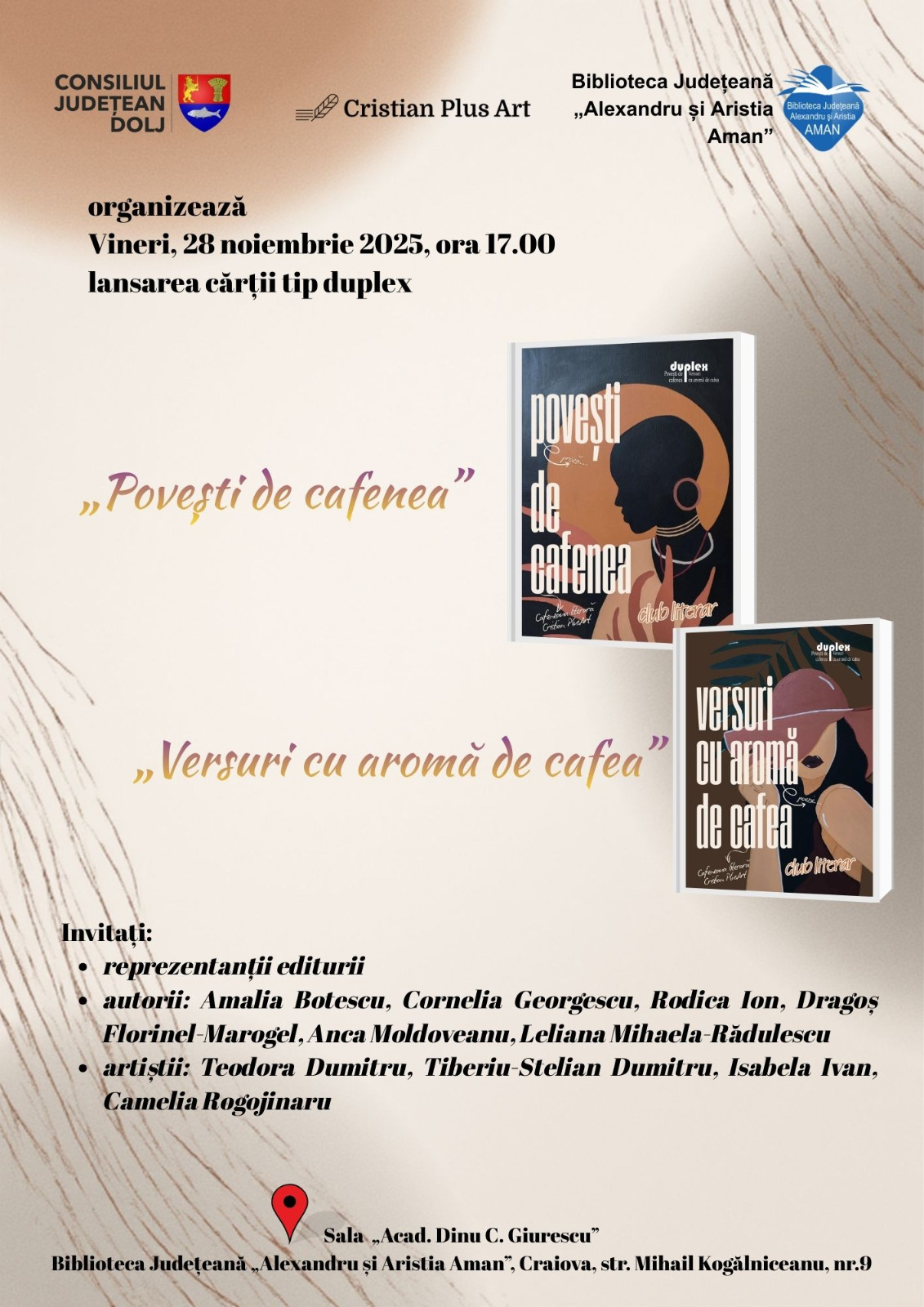 Biblioteca Județeană „Alexandru și Aristia Aman” găzduiește vineri, 28 noiembrie, lansarea volumului „Povești de cafenea”/„Versuri cu aromă de cafea”.