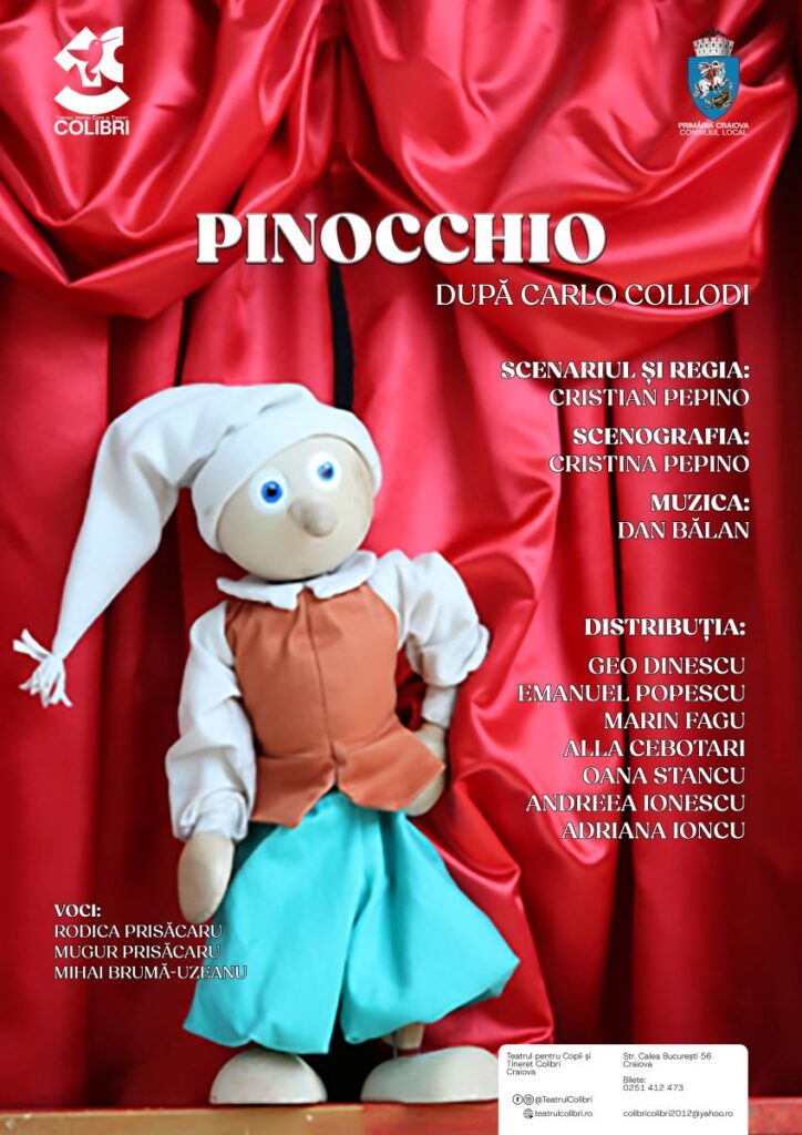 Sâmbătă, la ora 18:00, îl întâlnim pe „Pinocchio“, într-o adaptare după Carlo Collodi, scenariul şi regia Cristian Pepino. Interpreteză actorii: