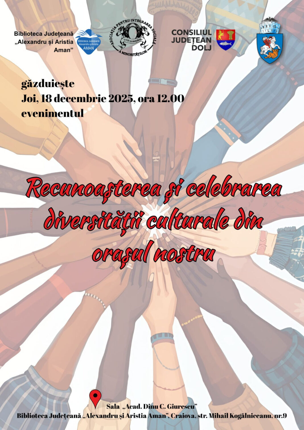 Biblioteca Județeană „Alexandru și Aristia Aman”  găzduiește joi, 18 decembrie, începând cu ora 12.00, evenimentul „Recunoașterea și celebrarea diversității culturale din orașul nostru”.