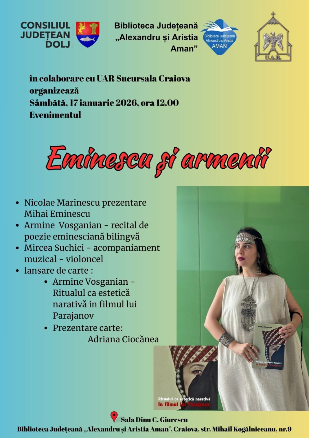 Biblioteca Județeană „Alexandru și Aristia Aman” alături de Uniunea Armenilor din România, Sucursala Craiova, organizează sâmbătă evenimentul „Eminescu și armenii”.