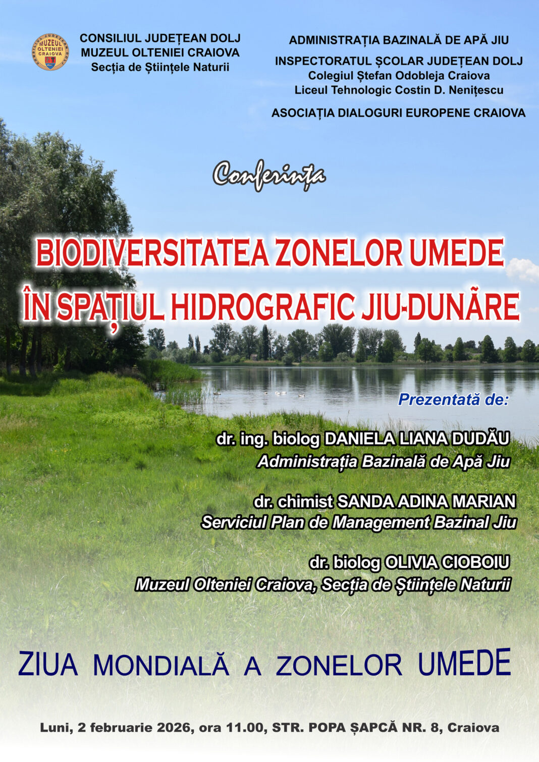 Elevi, profesori și specialiști în ecologie și hidrobiologie se reunesc luni, 2 februarie, la Muzeul Olteniei Craiova, pentru o lecție interactivă despre importanța zonelor umede, conservarea biodiversității și managementul ecosistemelor acvatice din sectorul inferior al Jiului și al fluviului Dunărea.