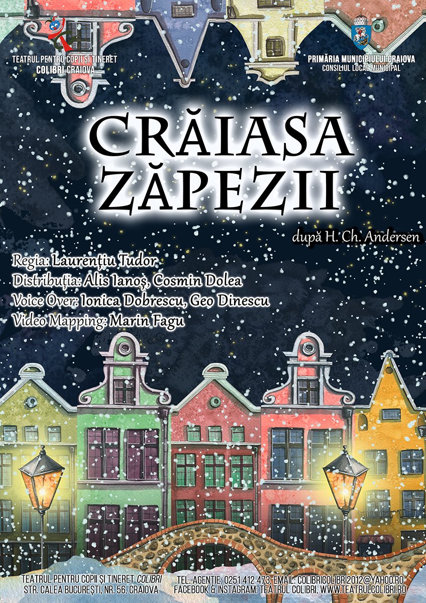 Spectacolul „Crăiasa Zăpezii”, adaptare după H.Ch. Andersen, regizat de Laurențiu Tudor, readuce pe scenă aventura și emoția poveștii clasice. Actorii Alis Ianoș și Cosmin Dolea, alături de voice over-ul lui Ionica Dobrescu și Geo Dinescu și video mapping-ul realizat de Marin Fagu, creează o experiență vizuală și emoțională pentru cei mici.