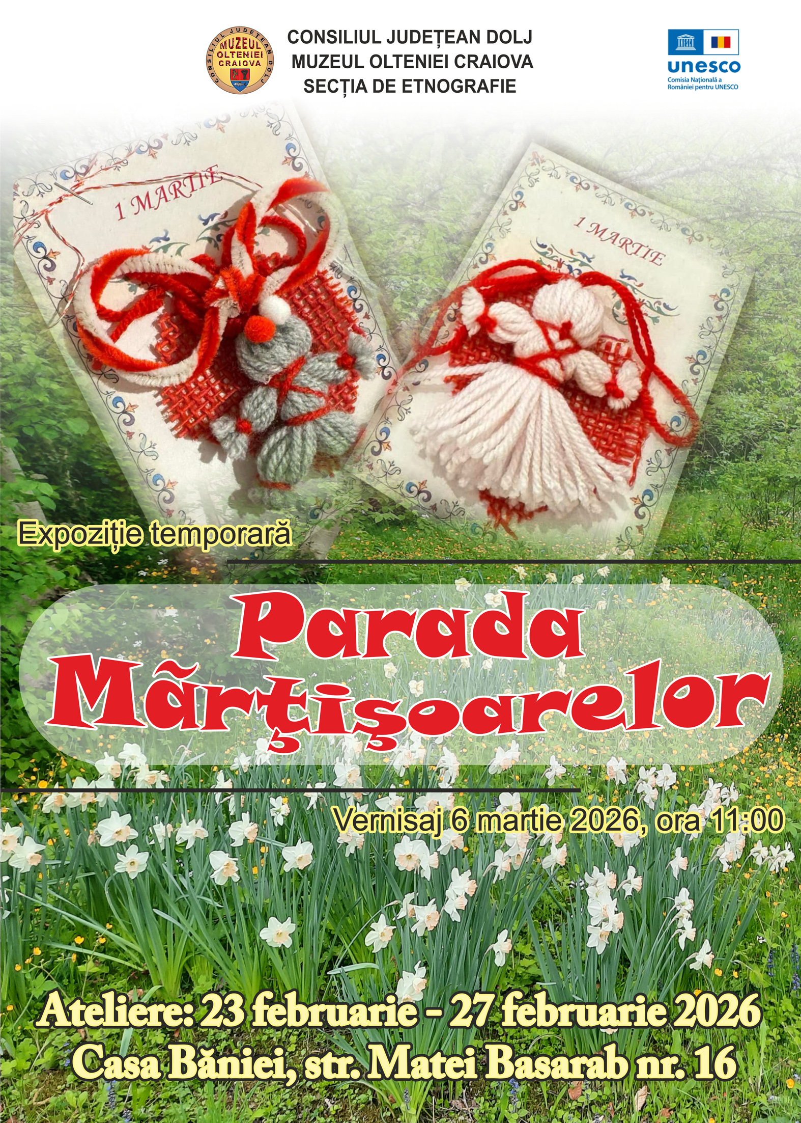 Pornind de la această idee, Muzeul Olteniei Craiova – Secția de Etnografie, în parteneriat cu CNR UNESCO și cu sprijinul Consiliului Județean Dolj, organizează, în perioada 23–27 februarie, ateliere de creație dedicate realizării de mărțișoare tradiționale, la sediul Casei Băniei.