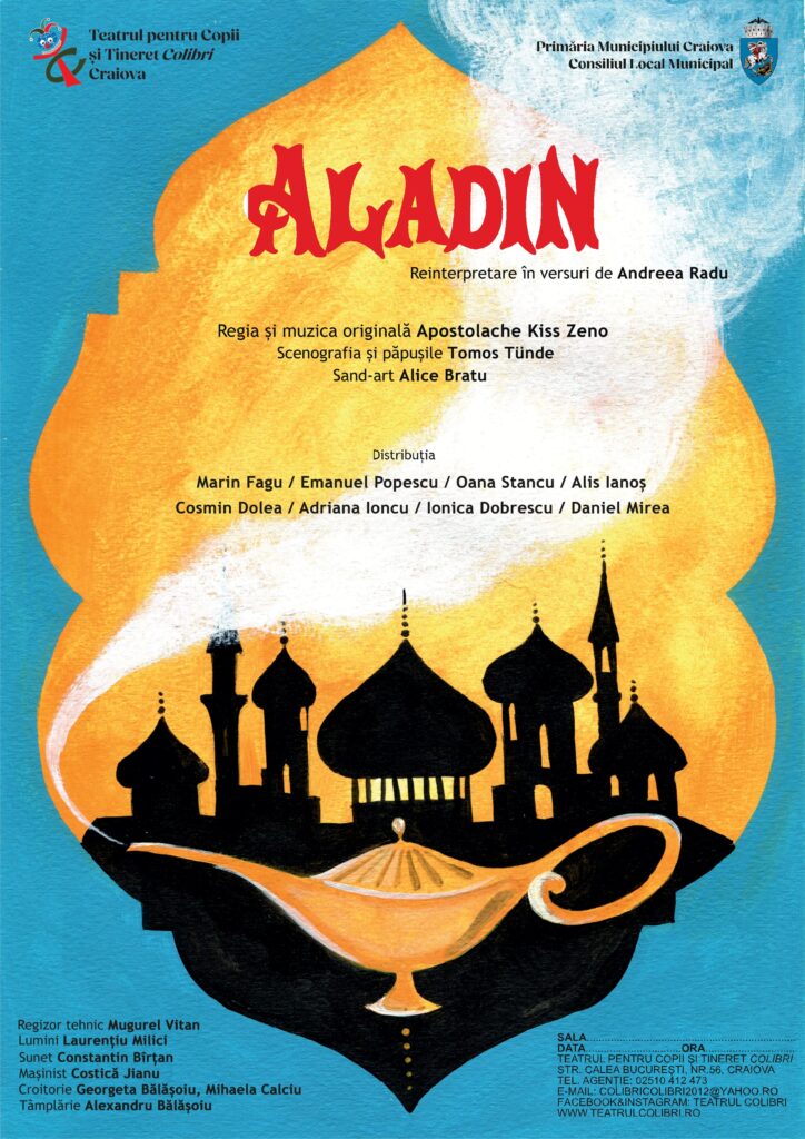 „Aladin” este o poveste amuzantă, educativă și muzicală, o metodă artistică de a descoperi poveștile universale și de a introduce copiii în magia teatrului.
