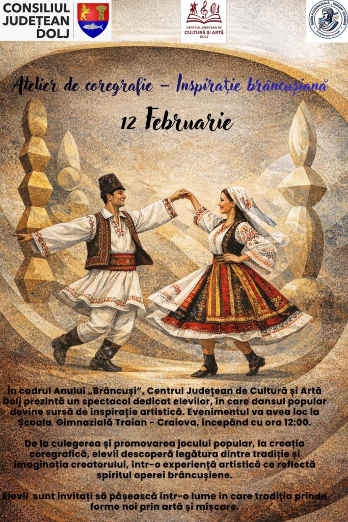În cadrul Anului „Brâncuși”, Centrul Județean de Cultură și Artă Dolj, prin Secția de Ansamblul de Dans Popular „Maria Tănase”, în parteneriat cu Școala Gimnazială „Traian” Craiova, organizează un eveniment dedicat elevilor, în care dansul popular devine punct de plecare pentru creație artistică.