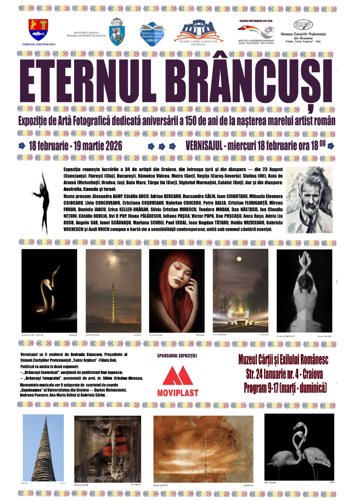 Miercuri, 18 februarie, de la ora 18:00, Muzeul Cărții și Exilului Românesc găzduiește vernisajul expoziției „Eternul Brâncuși”, un eveniment dedicat împlinirii a 150 de ani de la nașterea marelui sculptor român.