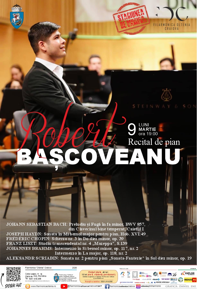 Pianistul Robert Bașcoveanu va susține un recital luni, 9 martie, de la ora 19:00, la Filarmonica Oltenia. Evenimentul promite o seară deosebită, cu un program variat ce traversează stiluri și epoci muzicale.