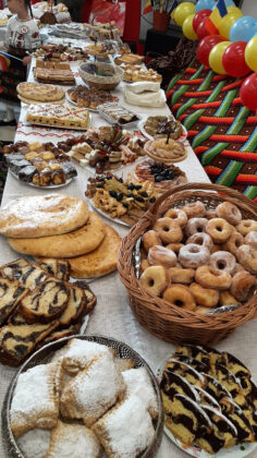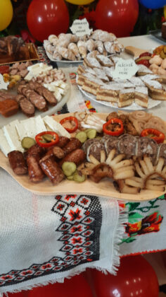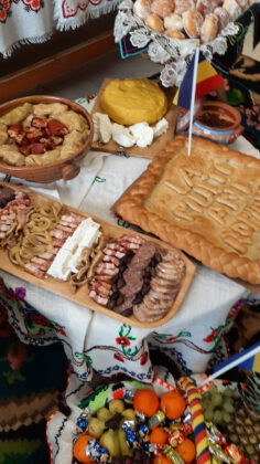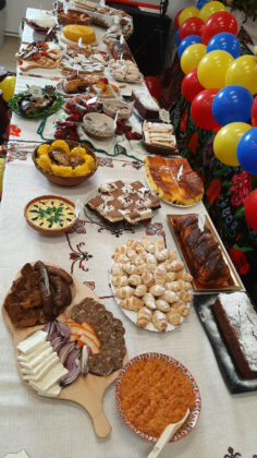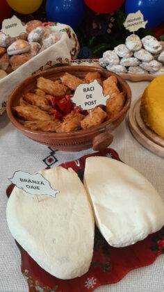 - „Dolju-n bucate”: raci umpluți cu orez, pui pe sare, turtițe, slănină, cârnați, sarmale, fasole cu ciolan, urzici cu usturoi, plăcinte, gogoși și cozonaci.