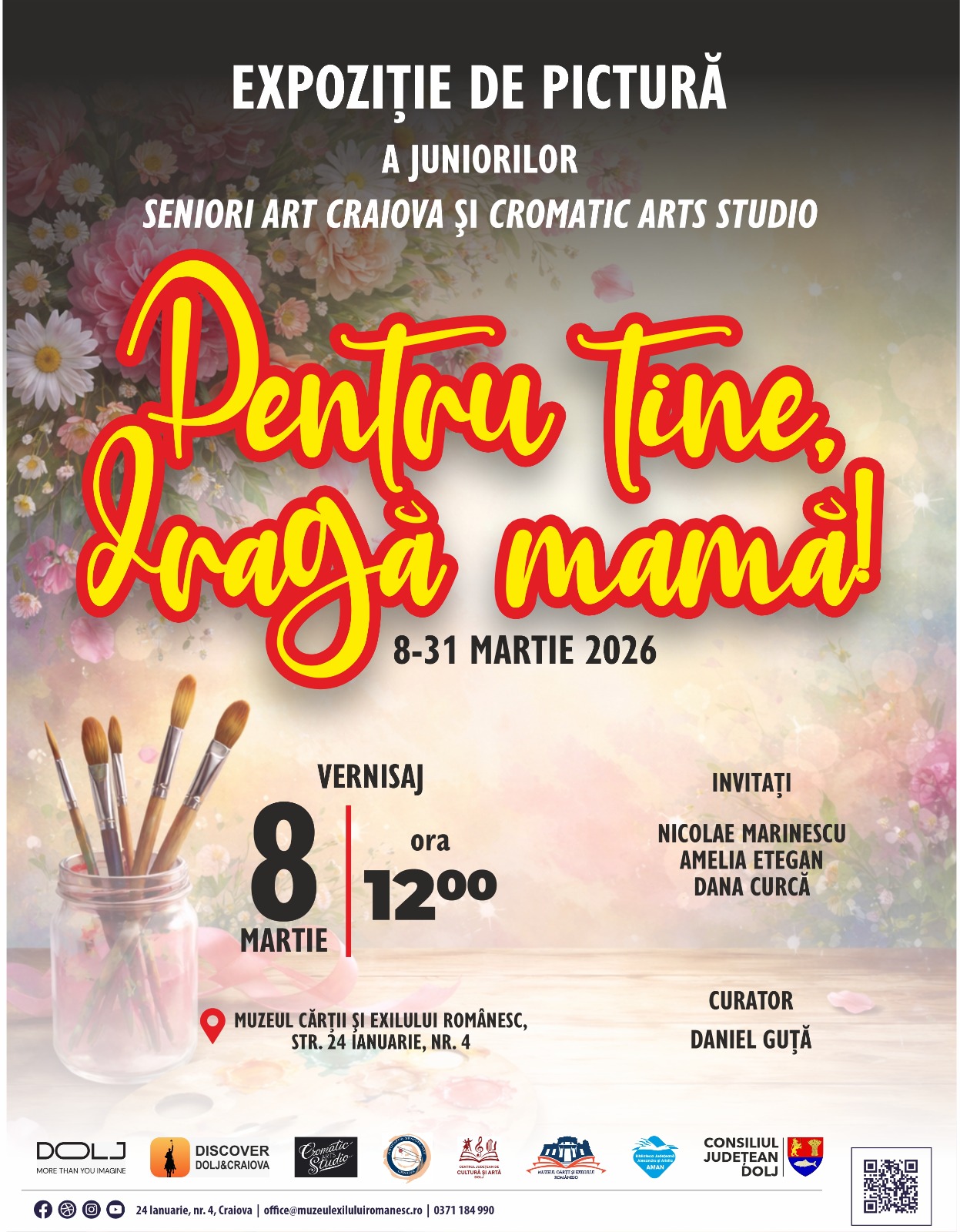 Muzeul Cărții și Exilului Românesc găzduiește duminică, 8 martie 2026, la ora 12:00, vernisajul expoziției de pictură „Pentru tine, dragă mamă”, organizată de Centrul Județean de Cultură și Artă Dolj, Secția pentru Conservarea și Promovarea Culturii Tradiționale, Asociația Seniori Art și Cromatic Arts Studio.