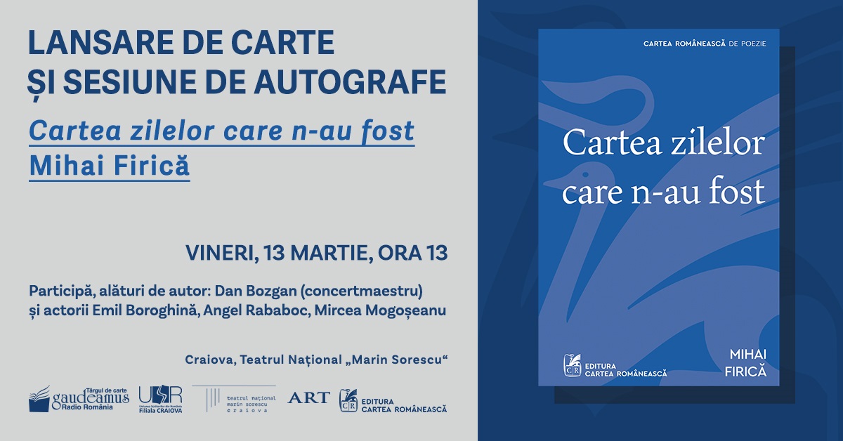 Volumul de versuri „Cartea zilelor care n-au fost”, semnat de scriitorul craiovean Mihai Firică, va fi lansat vineri, 13 martie, de la ora 13:00, la Teatrul Național Marin Sorescu, în cadrul Târgul de Carte Gaudeamus.