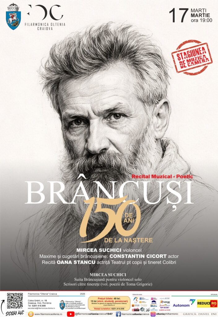 Publicul meloman este invitat la două evenimente artistice speciale organizate de Filarmonica Oltenia Craiova, care aduc pe scenă muzică de cameră, poezie și un omagiu dedicat marelui sculptor Constantin Brâncuși.