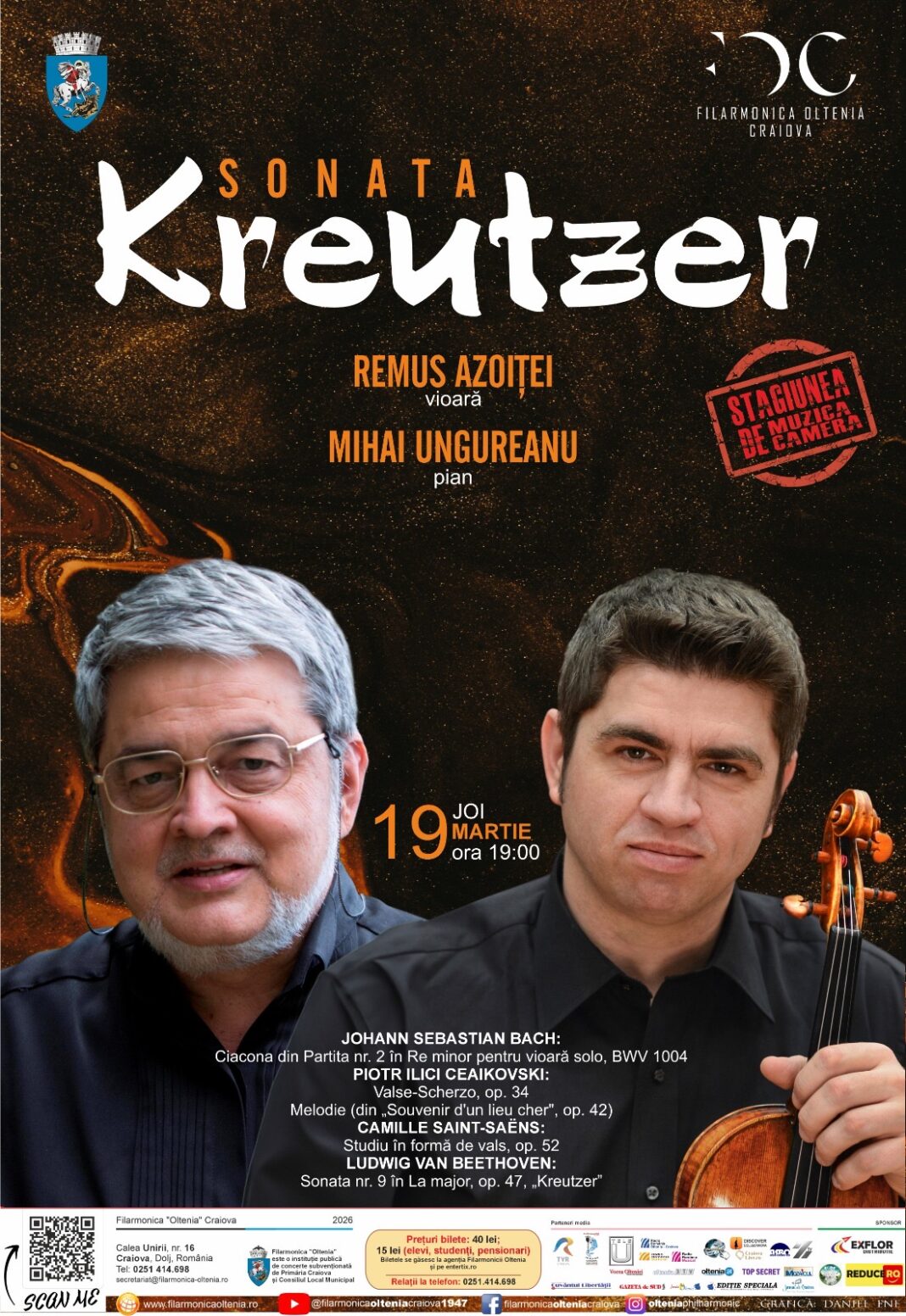 Joi, 19 martie, de la ora 19:00, violonistul Remus Azoiței și pianistul Mihai Ungureanu vor interpreta un program de excepție ce include lucrări semnate de Johann Sebastian Bach, Piotr Ilici Ceaikovski, Camille Saint-Saëns și Ludwig van Beethoven.