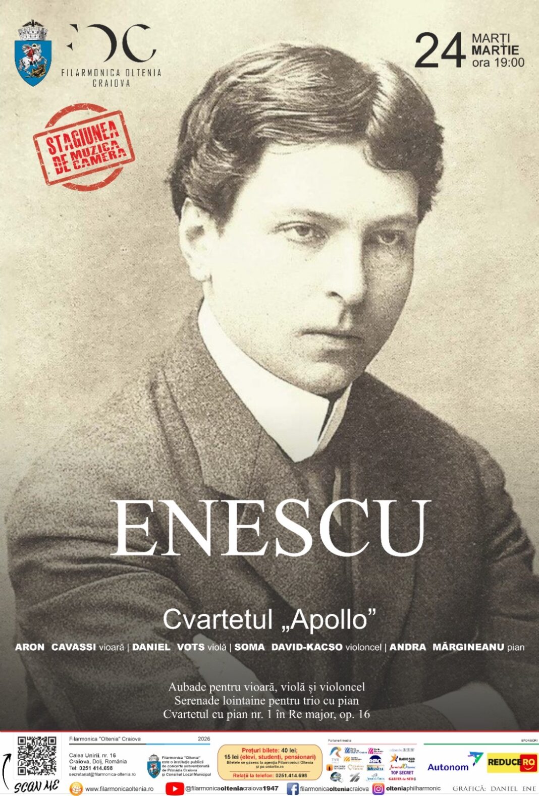 Melomanii sunt invitați, marți, 24 martie, ora 19:00, la un recital cameral de excepție susținut de Cvartetul „Apollo”, care propune o incursiune în universul sensibil al creației enesciene.