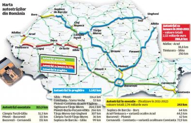 Ministerul Transporturilor şi Infrastructurii (MTI) a prezentat recent harta autostrăzilor pe care le va avea România în următorii zece ani. Dacă în 2010 avem 313,5 kilometri de autostradă, în 2020 vor exista circa 1.000 de kilometri. În prezent, sunt în execuţie pe mai multe şantiere 243 de kilometri de autostrăzi, la care se vor adăuga în 2011 alţi 288,8 kilometri. Valoarea cumulată a celor 532 de kilometri se ridică la cinci miliarde de euro. Ce remarcăm din harta prezentată de MTI este că toate autostrăzile României din 2010 vor ocoli regiunea Oltenia. Ruta Bucureşti – Timişoara se face pe traseul Piteşti – Sibiu – Orăştie – Deva – Lugoj. Celebra autostradă „Transilvania“ Braşov – Borş trece prin Târgu Mureş, Cluj-Napoca şi Suplacu de Barcău, iar în estul ţării avem legăturile Târgu Mureş – Iaşi, dar şi Ploieşti – Buzău – Focşani – Albiţa – de 266 de kilometri.