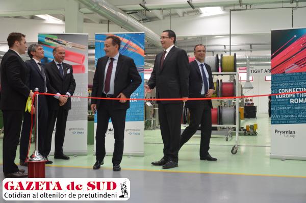 Prysmian Group, producător de cabluri şi sisteme pentru energie şi telecomunicaţii, prezent în România din 2005 prin compania PRYSMIAN Cabluri şi Sisteme SA din Slatina, a inaugurat, ieri după-amiază, prima secţie de cabluri de fibră optică din România. Printre participanţii la acest eveniment s-au numărat ambasadorul Italiei, Diego Brasioli, premierul Victor Ponta, precum şi persoane din conducerea Grupului Prysmian din Italia şi autorităţi locale, respectiv oameni de afaceri din judeţul Olt.